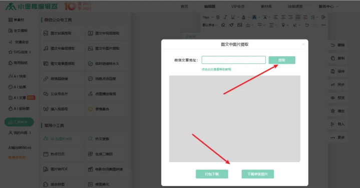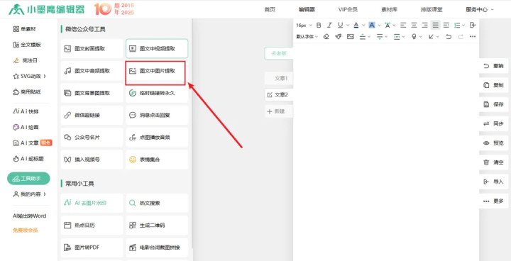 找到入口:打开小墨鹰编辑器,在左侧的工具栏里,找到并点击 “工具助手”。在弹出的菜单中,你就能看到 “图文中图片提取” 这个选项。